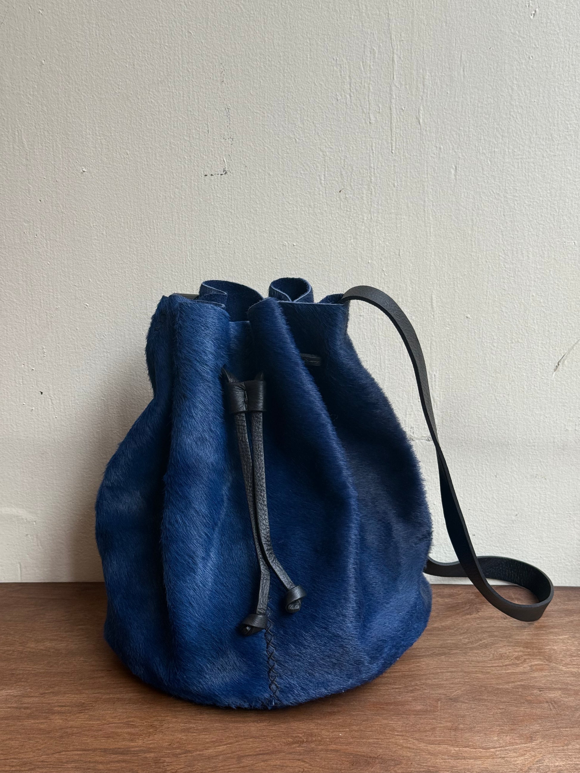 Bucket bag made with upcycled leather and hand cross-stitch detailing.